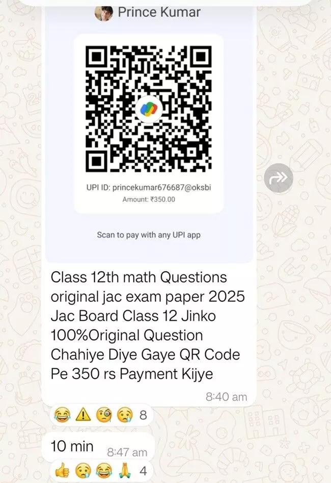 मीडिया को मिली जानकारी के मुताबिक दो दिन पहले जैक बोर्ड एग्जामिनेशन क्वेश्चन पेपर 2025 नाम से एक व्हाट्सएप ग्रुप क्रिएट किया गया था. इसमें एक स्कैनर का इस्तेमाल करते हुए छात्रों से प्रश्न पत्र देने के एवज में 350 रुपये की मांग की जा रही थी. इस ग्रुप में जुड़ने के लिए इस ग्रुप का लिंक दूसरे सोशल मीडिया साइट्स पर वायरल किया गया और देखते ही देखे उसे लिंक के जरिए क्वेश्चन पेपर वाले ग्रुप से 1000 से ज्यादा लोग जुड़ गए.