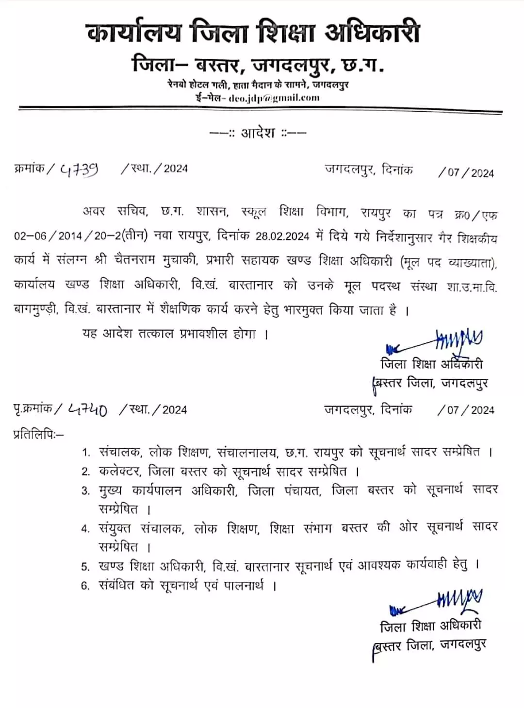 इसके अलावा गैर शिक्षकीय कार्य में संलग्न चैतराम मुचाकी को प्रभारी सहायक खंड शिक्षा अधिकारी (मूल पद व्याख्याता) कार्यालय खंड शिक्षा अधिकारी विकासखंड बास्तानार को उनके मूल पद संस्था शासकीय उच्चतर माध्यमिक विद्यालय बागमुंडी विकासखंड बास्तानार में शैक्षणिक कार्य करने हेतु भार मुक्त किया गया है।