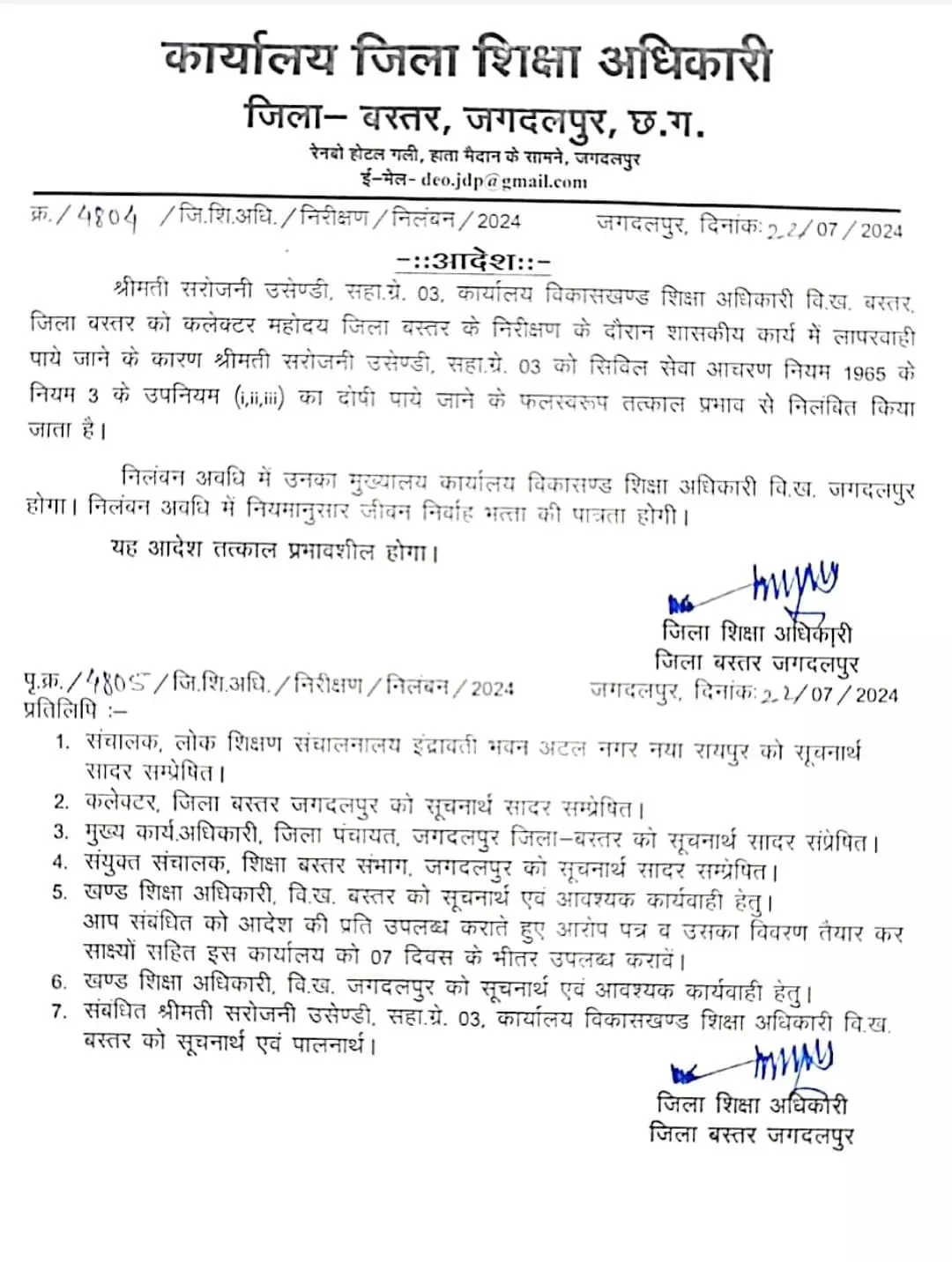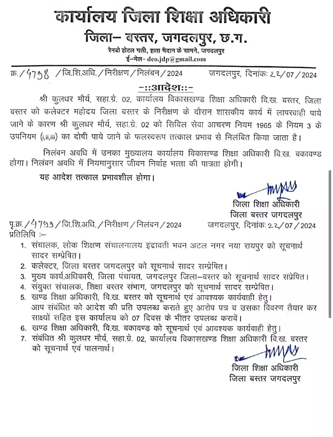 कलेक्टर विजय दयाराम ने हाल ही में बस्तर जिले के विकास खंडों का दौरा किया था। इस दौरान काम के भी समीक्षा की गई थी। शिक्षा विभाग के कार्यों में लापरवाही पाए जाने पर संबंधित तो के निलंबन के आदेश जिला शिक्षा अधिकारी को कलेक्टर विजय दयाराम ने दिए थे। कलेक्टर के निर्देशों के बाद शिक्षा विभाग में तीन बाबूओ को निलंबित किया गया है।