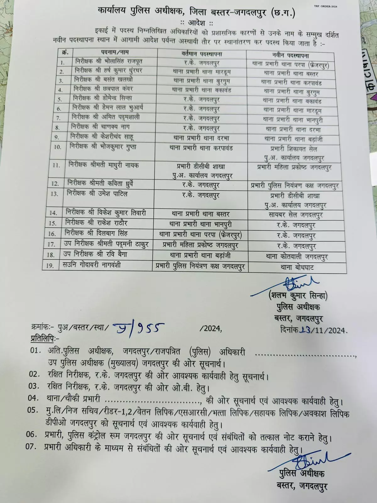 पुलिसिंग में कसावट लाने के लिए एसपी शलभ सिन्हा ने समीक्षा के बाद 16 निरीक्षकों के तबादला आदेश जारी किए हैं। सुरक्षा व्यवस्था और विभागीय कार्यों में लापरवाही पर एसपी सख्त है। थाना क्षेत्र में पुलिसिंग की ढिलाई पर सख्त रूप अपनाया है। एसपी ने परपा,बस्तर और भानपुरी थाना क्षेत्रों में वसूली की मिल रही शिकायतों को संज्ञान लिया है। इन क्षेत्रों में वसूली को लेकर वीडियो भी वायरल हुए थे। जिस पर एसपी ने कार्यवाही की है।