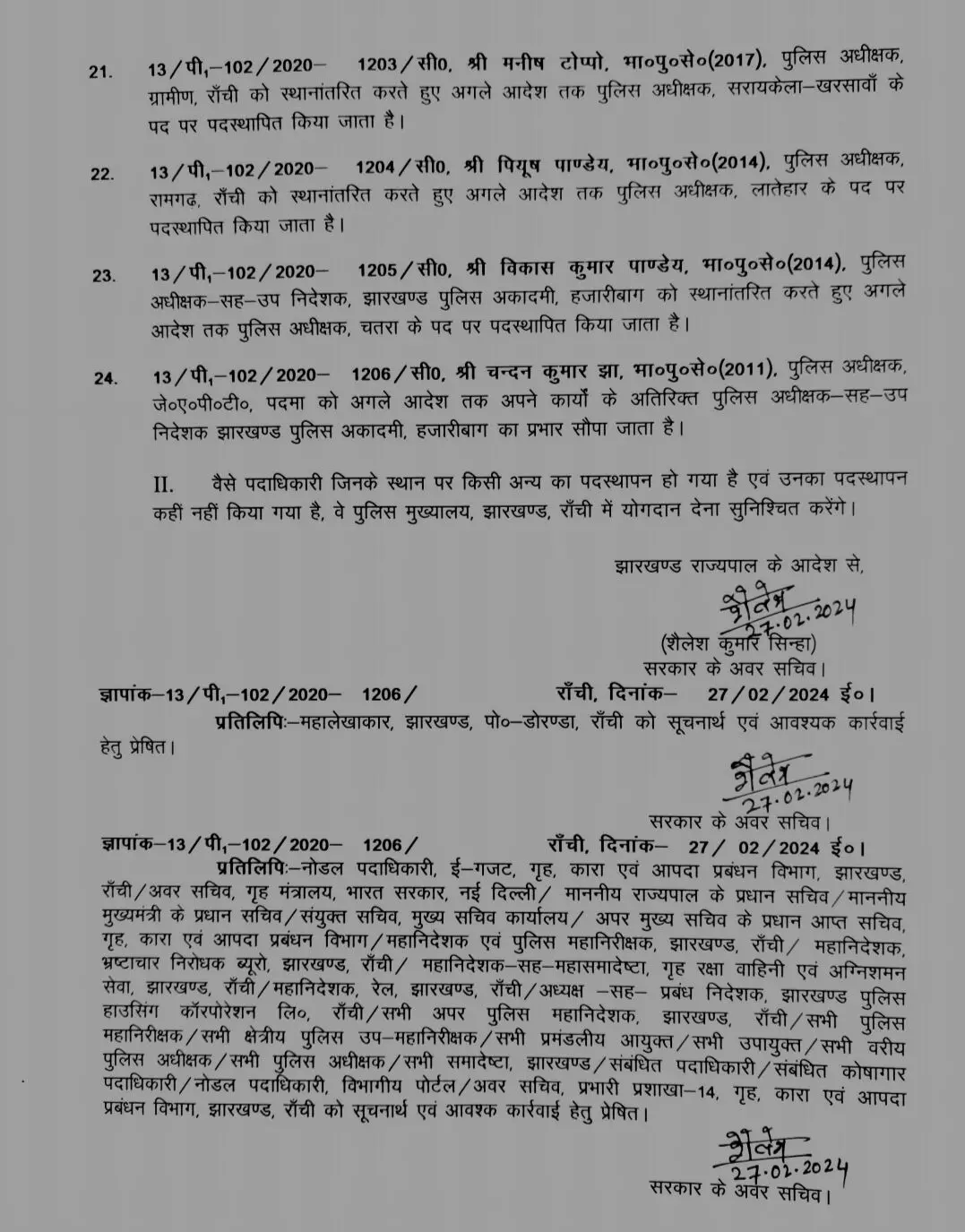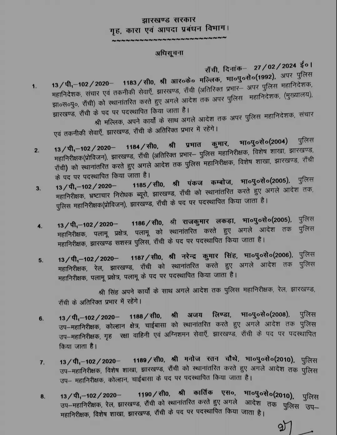 आईपीएस अधिकारी सुमित कुमार अग्रवाल को रांची का एसपी यातायात बनाया गया है. वहीँ सीनियर आईपीएस अधिकारी आरके मलिक को झारखंड पुलिस मुख्यालय में एडीजी मुख्यालय बनाया गया है. एसपी अंजनी अंजन को स्थानांतरित करते हुए रांची का ग्रामीण एसपी बनाया गया है.
