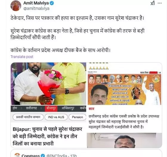 भाजपा नेता मालवीय ने एक्स पर दो फोटो पोस्ट किया है। एक में कांग्रेस नेता व ठेकेदार सुरेश चंद्राकर पीसीसी चेयरमैन दीपक बैज को बुके दे रहे हैं और बैज बुके के साथ उनसे फोटो खिंचवा रहे हैं। दूसरी फोटो ठेकेदार की राजनीतिक रसूख और उपलब्धियों से संबंधित है। इसमें छत्तीसगढ़ प्रदेश कांग्रेस एससी प्रकोष्ठ के प्रदेश उपाध्यक्ष सुरेश चंद्राकर को महारष्ट्र चुनाव महत्वपूर्ण जिम्मेदारी सौंपे जाने से संबंधित है। जिसमें एआईसीसी ने उनको चुनाव में जिम्मेदारी सौंपी थी। ठेकेदार, जिस पर पत्रकार की हत्या का इल्ज़ाम है, उसका नाम सुरेश चंद्राकर है. सुरेश चंद्राकर कांग्रेस का बड़ा नेता है, जिसे हर चुनाव में कांग्रेस की तरफ से बड़ी ज़िम्मेदारियाँ सौंपी जाती हैं। कांग्रेस के वर्तमान प्रदेश अध्यक्ष दीपक बैज के साथ आरोपी।