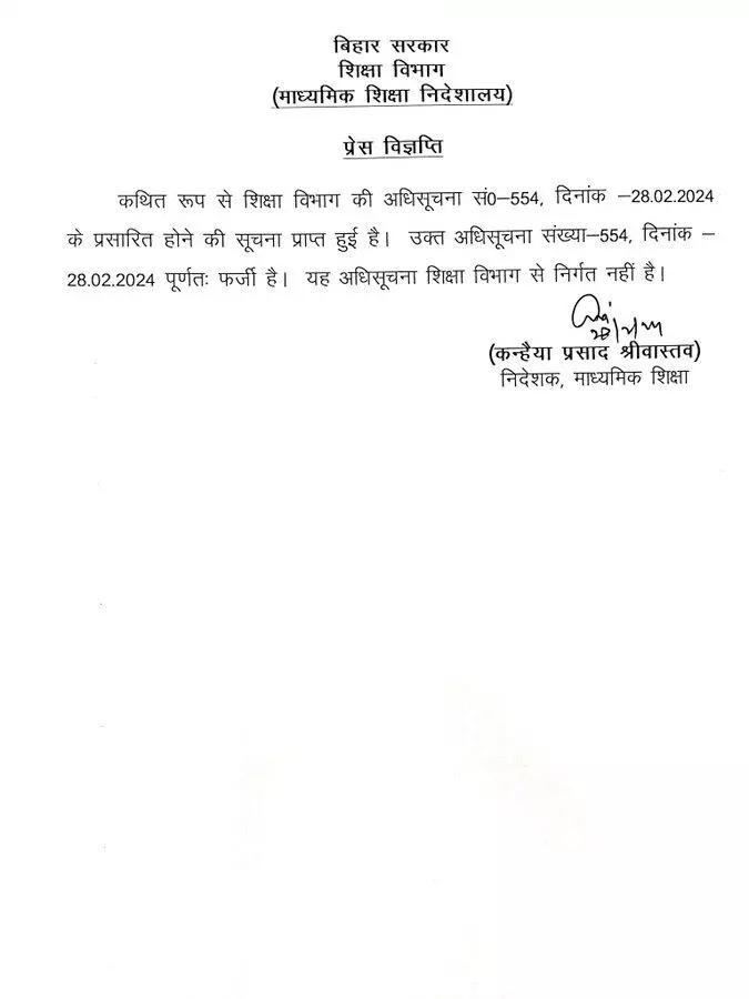 जानकारी के मुताबिक़, यह आदेश पत्र 28 फरवरी को जारी किया गया था. जारी फर्जी पत्र में कहा गया कि बच्चे सुबह दस से चार बजे तक स्कूल में रहेंगे. वहीँ शिक्षक सुबह 9.45 बजे स्कूल आएंगे। और शाम 4.15 बजे चले जाएंगे. आदेश पत्र में कहा गया है कि शनिवार को दोपहर दो बजे स्कूलों की छुट्टी होगी। इतना ही नहीं पत्र पर विभाग के माध्यमिक निदेशक कन्हैया प्रसाद श्रीवास्तव का हस्ताक्षर भी किया गया है. यह पत्र जारी होते ही वायरल हो गया.