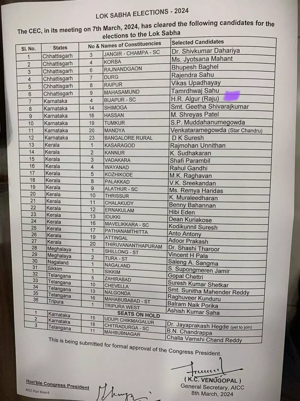 इस बीच सोशल मीडिया में वायरल हो रही इस सूची में छत्तीसगढ़ की राजनांदगांव सीट से पूर्व सीएम भूपेश बघेल का नाम है। वहीं, रायपुर सीट से विकास उपाध्याय, दुर्ग से राजेंद्र साहू, जांजगीर-चांपा से शिवकुमार डहरिया और महासमुंद से ताम्रध्वज साहू का नाम है। इस सूची पर कांग्रेस के राष्ट्रीय महासचिव केसी वेणुगोपाल का हस्ताक्षर भी है, लेकिन कांग्रेस के नेता इसे फर्जी बता रहे हैं।