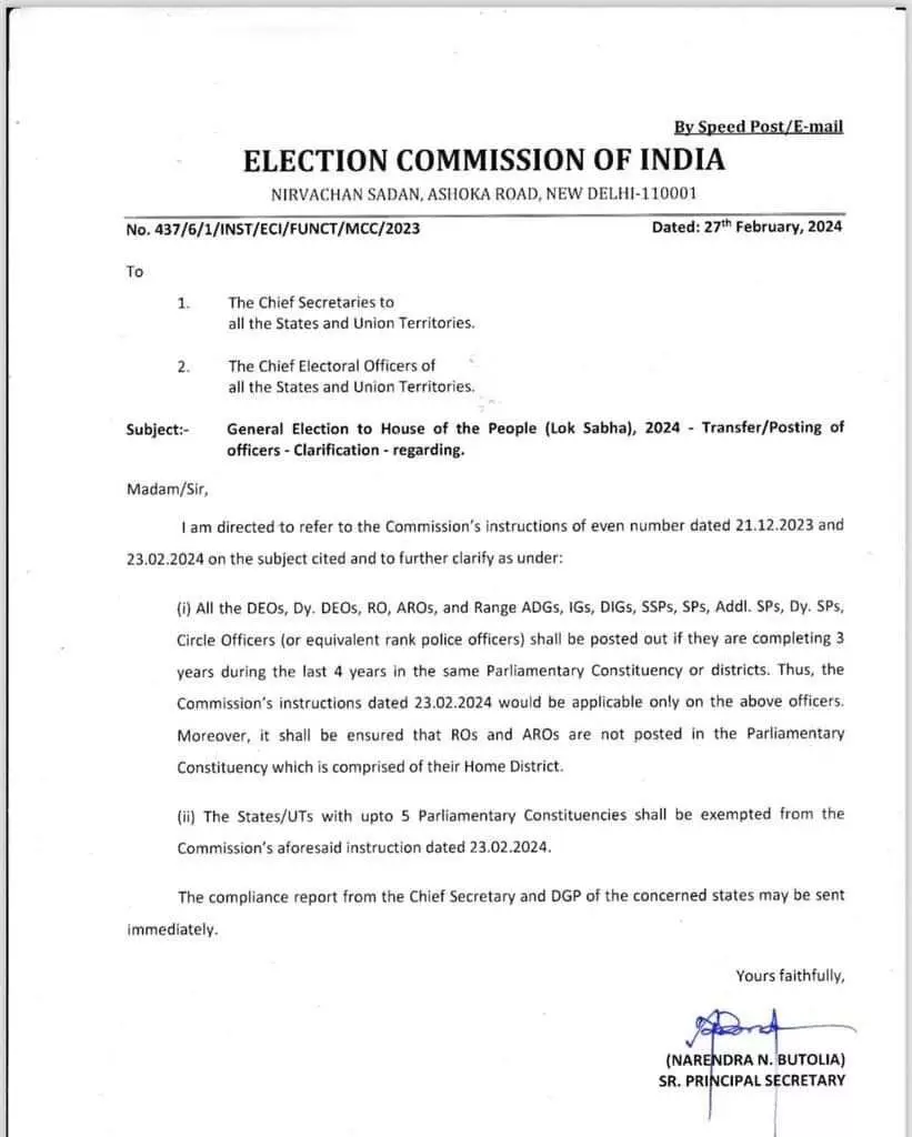 आयोग ने बताया है कि सभी डीईओ, उप. डीईओएस, आरओ, एआरओएस, और रेंज एडीजी, आईजीएस, डीआइजी, एसएसपी, अतिरिक्त एसपी, । एसपी, डीएसपी, सर्कल अधिकारी (या समकक्ष रैंक के पुलिस अधिकारी) को बाहर तैनात किया जाएगा यदि वे एक ही संसदीय निर्वाचन क्षेत्र या जिलों में पिछले 4 वर्षों के दौरान 3 वर्ष पूरा कर रहे हैं। आयोग के निर्देश 23.02.2024 केवल उपरोक्त अधिकारियों पर ही लागू होंगे। इसके अलावा, यह सुनिश्चित किया जाएगा कि आरओ और एआरओ को उस संसदीय क्षेत्र में तैनात नहीं किया जाए जिसमें उनका गृह जिला शामिल है।