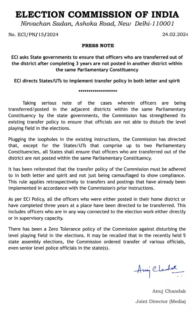 आयोग की तरफ से जारी इस ताजा बयान में कहा गया है कि गृह जिला व 3 साल से ही स्‍थान पर पदस्‍थ अफसरों के ट्रांसफर का मतलब यह नहीं है कि एक ही संसदीय क्षेत्र के एक जिला से हटाकर दूसरे जिला में भेद दें बल्कि ट्रांसफर नीति का पालन का उद्देश्‍य एक संसदीय क्षेत्र से दूसरे संसदीय क्षेत्र में ट्रांसफर है। आयोग ने सभी राज्‍यों को अब तक हुए तबादलों का इस आधार पर समीक्षा करने का निर्देश दिया है। आयोग के इस निर्देश में साफ है कि ट्रांसफर में चालबाजी नहीं चलेगी।
