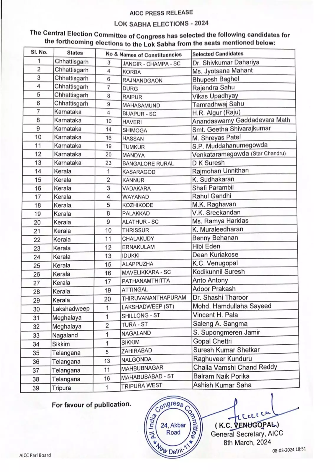 पहली सूची में 39 प्रत्याशियों के नामों की घोषणा की गई। इसमें राहुल गांधी के साथ ही छत्तीसगढ़ के पूर्व सीएम भूपेश बघेल और ताम्रध्वज साहू का नाम भी शामिल है। कुछ देर पहले वायरल हुई सूची ही फाइनल सूची है। वेणुगोपाल ने इसी सूची को प्रेसवार्ता के दौरान पढ़ा। 39 में 15 सामान्य वर्ग के हैं। 24 एससी, एसटी, ओबीसी और अल्प संख्यक हैं।