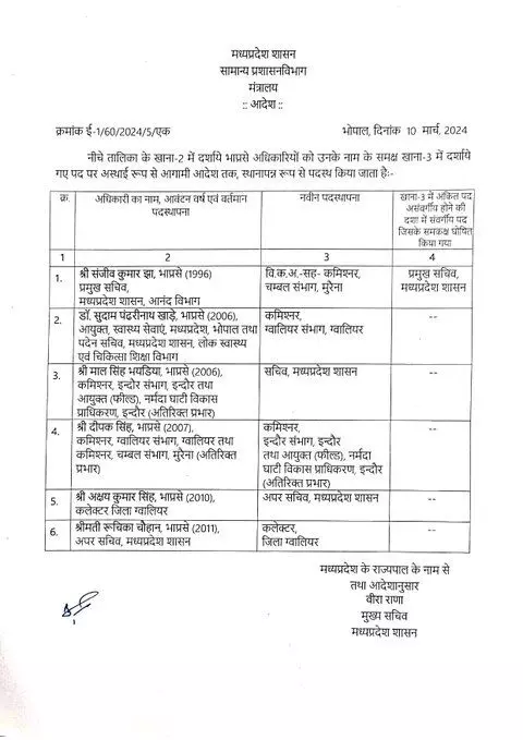MP IAS Transfer News: मध्यप्रदेश में आईएएस और आईपीएस अधिकारियों के तबादलों का दौर जारी है. रविवार को मध्यप्रदेश सरकार ने एक बार आईएएस अधिकारियों का फेरबदल किया है. सामान्य प्रशासन विभाग तबादलों का आदेश जारी किया है. जारी आदेश के अनुसार 6 आईएएस अधिकारियों को इधर से उधर किया है.