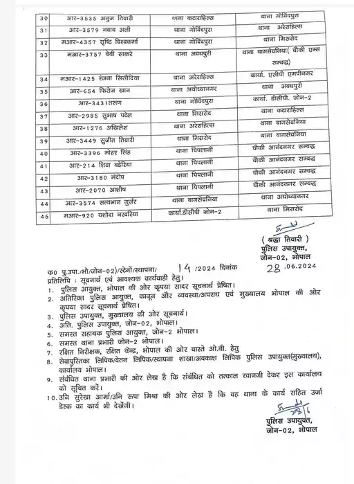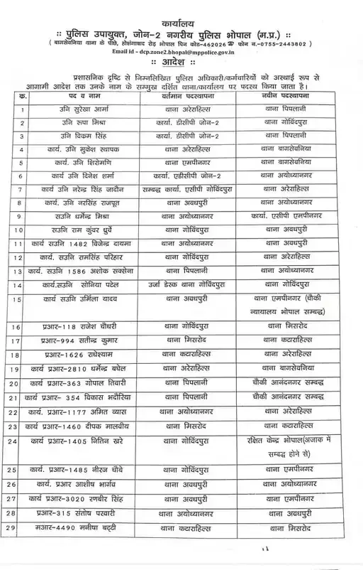 भोपाल के जोन 2 में पदस्थ कई थानों के सब इंस्पेक्टर, एएसआई, कांस्टेबल सहित कई अधिकारियों को इधर से उधर किया गया है. भोपाल जोन 2 पुलिस उपायुक्त श्रद्धा तिवारी ने तबादले का आदेश जारी किया है.