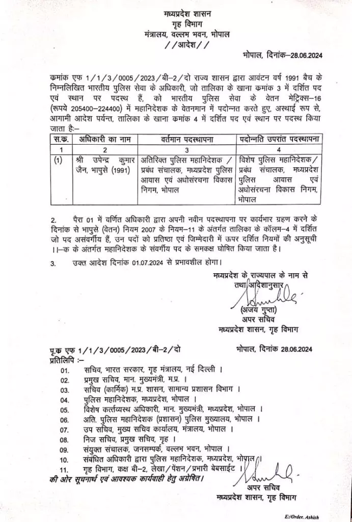 इसके अलावा अतिरिक्त पुलिस महानिदेशक आईपीएस उपेंद्र कुमार जैन (IPS Upendra Kumar Jain) का प्रमोशन किया गया है. उन्हें विशेष पुलिस महानिदेशक(DGP) बनाया गया है. उपेंद्र कुमार 1991 बैच के आईपीएस अफसर है. इसे लेकर गृह विभाग, अपर सचिव अजय गुप्ता ने आदेश जारी किया है. देखे आदेश..