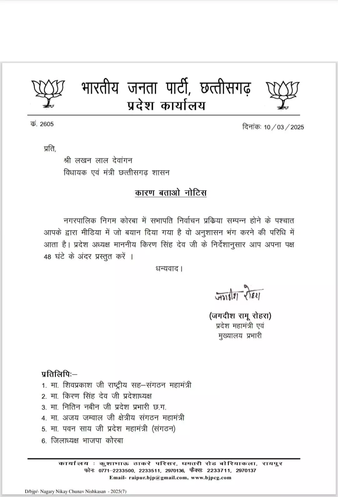 पार्टी के प्रदेश महामंत्री जगदीश रोहरा ने नोटिस में लिखा है कि कोरबा नगर निगम में सभापति के निर्वाचन प्रक्रिया पूर्ण होने के बाद आपने मीडिया में जो बयान दिया है, वह अनुशासन भंग करने की परिधि में आता है। अतएव, आप 48 घंटे के भीतर जवाब प्रस्तुत करें।