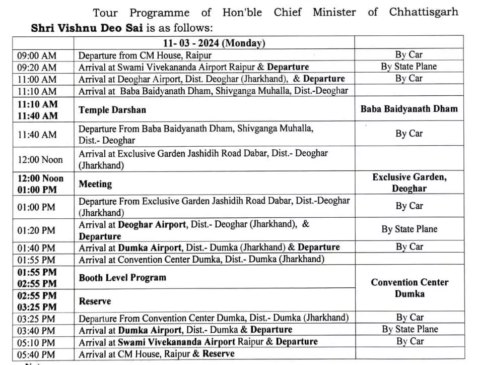 Program of Vishnudeo Sai: रायपुर। मुख्यमंत्री विष्णु देव साय आज (11 मार्च) को झारखंड के दौरे पर रहेंगे। सीएम सुबह 9 बजे स्टेट प्लेन से देवघर के लिए उड़ान भरेंगे। वहां सबसे पहले बाबा बैद्यनाथ धाम में दर्शन करेंगे, उसके बाद पार्टी की बैठकों में शामिल होंगे।