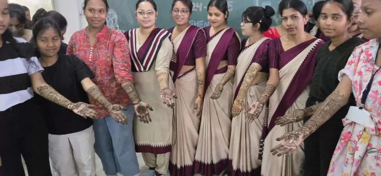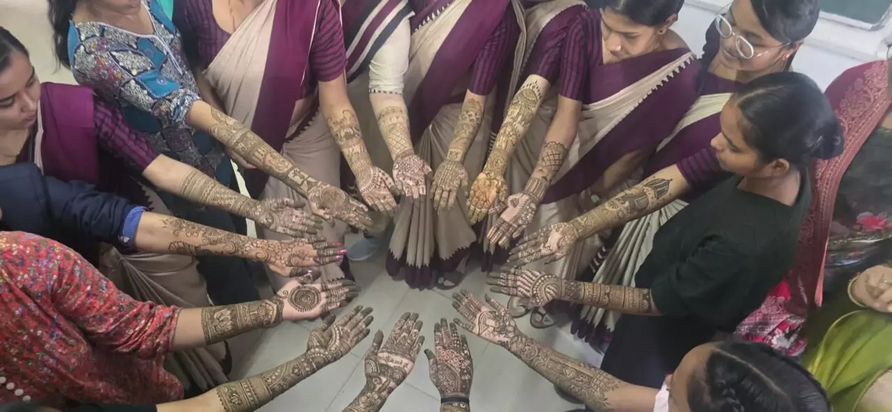 दूसरे चरण में दोपहर 2 बजे से मेंहदी प्रतियोगिता का आयोजन किया गया जिसमें पारंपरिक एवं अरेबिएन दोनों विधाओं में छात्राओं ने बेल, ढोल, हाथी, कमल, मोर आदि चित्रों को खूबसूरती के साथ मेंहदी द्वारा हथेलियों पर सजाया। निर्णायक मंडल को विजेता चुनने में काफी मशक्कत करनी पड़ी। निम्न प्रतिभागियों को विजेता घोषित किया गया।