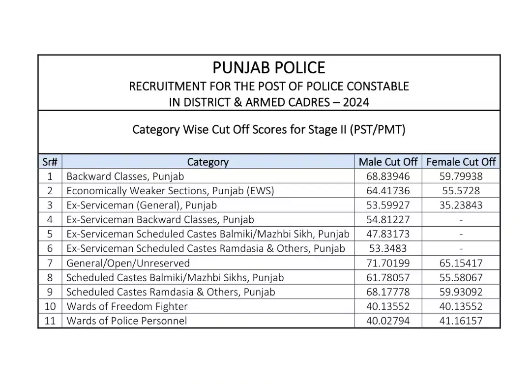 Punjab Police Constable Result 2024 👉:: Category Wise Cut Off Scores For Stage II (PST/PMT) PDF