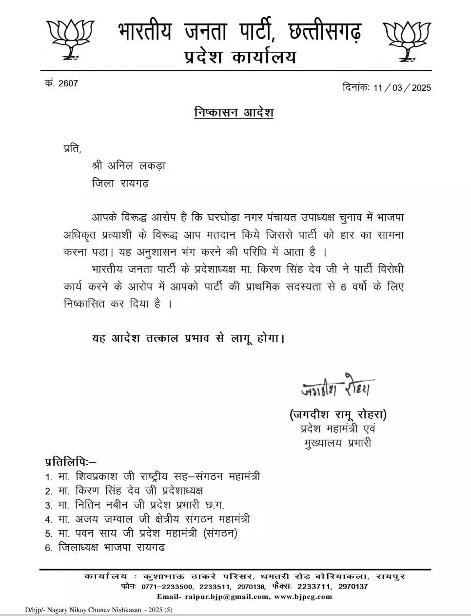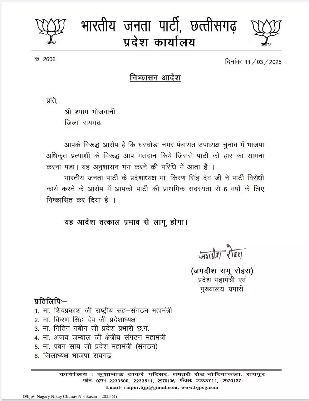 Raigarh News: रायगढ़। घरघोड़ा नगर पंचायत के उपाध्यक्ष चुनाव में बहुमत के बावजूद भाजपा को हार का सामना करना पड़ा है। हार के बाद जिला भाजपा ने दो पार्षदों द्वारा क्रास वोटिंग करने की जानकारी प्रदेश भाजपा कार्यालय को भेजी थी। प्रदेश भाजपा अध्यक्ष ने इसे गंभीरता से लेते हुए पार्टी अनुशासन को धता बताते हुए क्रास वोटिंग करने वाले पार्षद श्याम भोजवानी और अनिल लकड़ा को 6 साल के लिए निष्काषित कर दिया है।