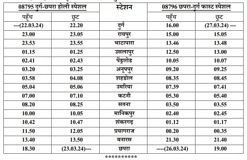 08793 दुर्ग-पटना होली स्पेशल दुर्ग से 22 मार्च, 2024 (शुक्रवार) तथा 08794 पटना-दुर्ग होली स्पेशल पटना से 23 मार्च, 2024 (शनिवार) को छुटेगी । इस स्पेशल ट्रेन में 2 एस.एल.आर/एसएलआरडी, 02 सामान्य, 14 स्लीपर, 04 एसी-III, 01 एसी -II सहित कुल 23 कोच रहेगी।