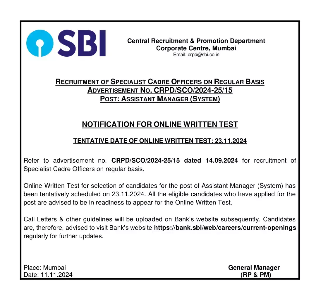 SBI SO Admit Card 2024: स्टेट बैंक ऑफ इंडिया (SBI) ने विशेषज्ञ कैडर अधिकारी (SCO) परीक्षा के लिए एडमिट कार्ड जारी कर दिया है। यह परीक्षा 23 नवंबर 2024 को होगी, और इसका विज्ञापन संख्या CRPD/SCO/2024-25/15 है। इस भर्ती अभियान में 1511 पदों के लिए आवेदन मांगे गए हैं, जिनमें डिप्टी मैनेजर (सिस्टम्स), असिस्टेंट मैनेजर (सिस्टम्स), प्रोजेक्ट मैनेजमेंट, क्लाउड ऑपरेशन्स, आईटी आर्किटेक्चर और इन्फॉर्मेशन सिक्योरिटी जैसे पद शामिल हैं।