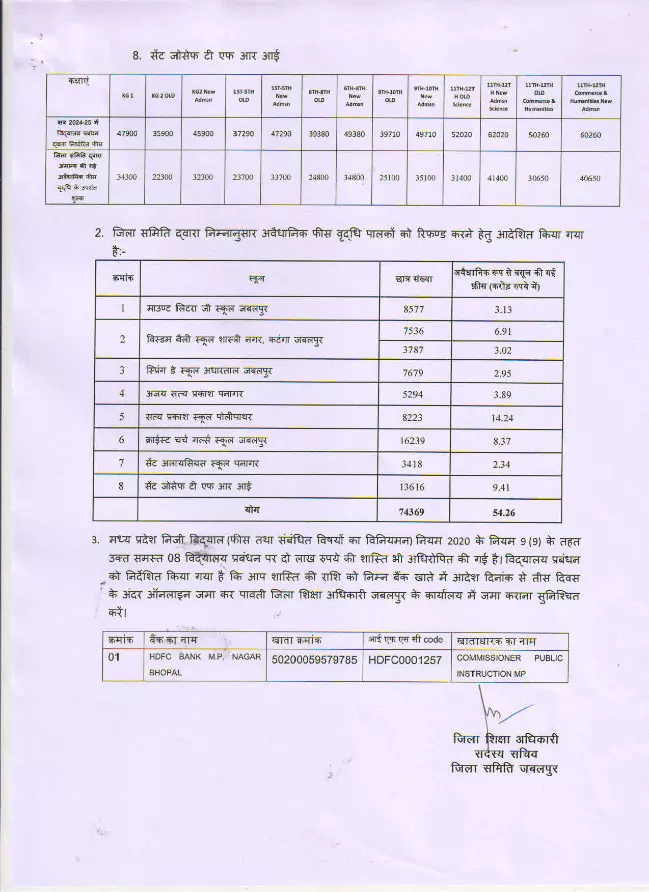 जबलपुर: मध्यप्रदेश के जबलपुर जिले में निजी स्कूलों की मनमानी के खिलाफ प्रशासन की कार्रवाई लगातार जारी है. इसी कड़ी में प्रशासन ने बड़ा एक्शन लिया है. 8 निजी स्कूलों को 54.26 करोड़ लौटाने के आदेश दिया है. इन स्कूलों के संचालकों ने अवैधानिक रूप से अभिभावको से फीस वसूले थे.