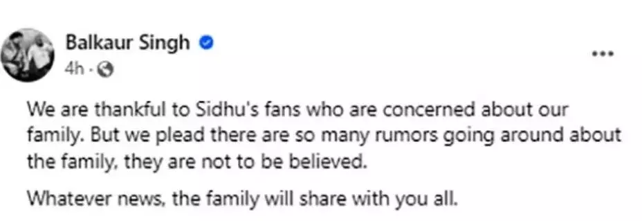 सिंगर सिद्धू मूसेवाला के पिता का क्या है रिएक्शन:- बलकौर सिंह ने लिखा- हम सिद्धू के फैंस के आभारी हैं जो हमारे परिवार को लेकर इतना चिंतित हैं. मेरी फैमिली को लेकर कई सारी अटकलें चल रही हैं. मेरी विनती है इन सभी रूमर्स पर यकीन ना करें. जो भी खबर होगी, परिवार आप सबके साथ शेयर करेगा. सिद्धू मूसेवाला के पिता के इस रिएक्शन के बाद उम्मीद है अफवाहों पर विराम लगेगा. सिद्धू के फैंस जल्द खुशखबरी सुनने की उम्मीद कर रहे हैं. मूसेवाला परिवार में किलकारी गूंजने को लेकर सभी सुपर एक्साइटेड हैं.