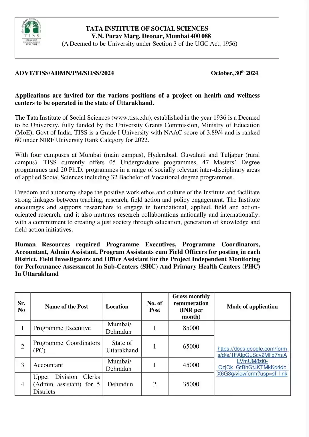 TISS Recruitment 2024 Notification: उत्तराखंड में स्वास्थ्य और कल्याण केंद्र परियोजना के लिए 33 पदों पर निकली भर्ती, अंतिम तिथि 15 नवंबर 2024