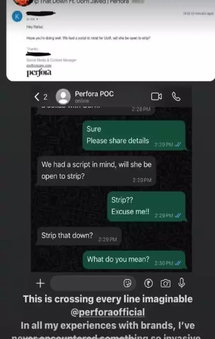 जानकरी के मुताबिक, उर्फी जावेद ने अपने सोशल मीडिया अकाउंट पर एक पोस्ट किया है, जिसमें एक्ट्रेस ने ओरल केयर ब्रांड के मेल का स्क्रीनशॉट शेयर किया है। इस पोस्ट में ओरल केयर ब्रांड ने लिखा है कि हमारे पास उर्फी के लिए एक स्क्रिप्ट है, क्या वह स्ट्रिप (कपड़े उतारने) करने के लिए तैयार हैं? उर्फी ने एक स्क्रीनशॉट भी शेयर किया है, जिसमें लिखा है कि हमारे पास एक स्क्रिप्ट है, क्या वह स्ट्रिप के लिए तैयार हैं? इस सवाल के जवाब में उर्फी ने पूछा कि स्ट्रिप का मतलब क्या होता है? जिसके जवाब में आया कि स्ट्रिप दैट डाउन।