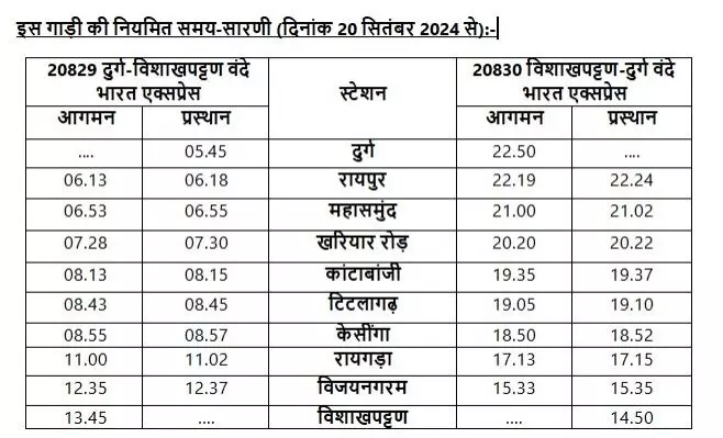 प्रधानमंत्री नरेंद्र मोदी दिनांक 16 सितंबर, 2024 को रायपुर (दुर्ग)-विशाखपट्टण वंदे भारत उदघाटन स्पेशल एक्सप्रेस को वीडियो कान्फ्रेंसिंग के माध्यम से हरी झंडी दिखाकर शुभारंभ करेंगे । गाड़ी संख्या 20829/20830 दुर्ग-विशाखपट्टण-दुर्ग वंदे भारत एक्सप्रेस ट्रेन की सेवा सप्ताह में छह दिन (गुरुवार को छोड़कर) दोनों छोर से संचालित की जाएगी। पहे दिन यह ट्रेन उदद्घाटन स्पेशल के रूप में स्पेशल समय-सारणी के अनुसार चलाई जाएगी । 20 सितंबर, 2024 से ट्रेन नं. 20829/20830 दुर्ग-विशाखपट्टण-दुर्ग वंदे भारत एक्सप्रेस ट्रेन अपने नियमित समय-सारणी के अनुसार चलेगी ।