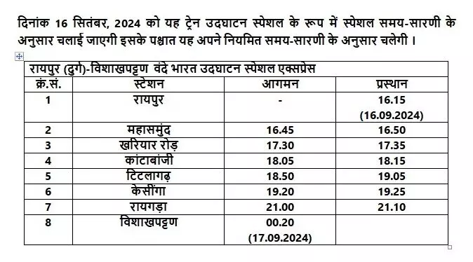 रायपुर स्टेशन से उद्घाटन स्पेशल के रूप में वंदेभारत स्पेशल समय-सारणी के अनुसार चलेगी।